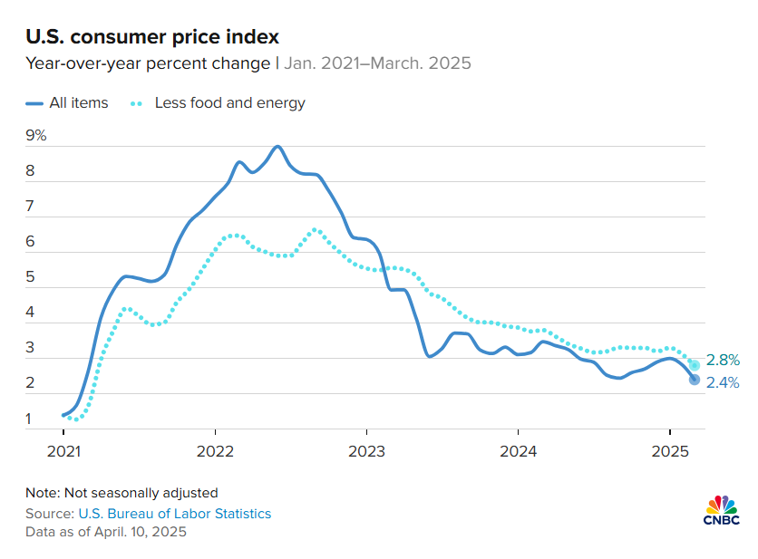 Inflation data came also came in last week at 2.4% which in a vacuum would be amazing news. We are getting closer to the 2% target and in theory, expectations would pick up for more rate cuts. Again, this news barely made the front page with all the other uncertainty causing commotion. See the chart below for the recent history of the CPI data.