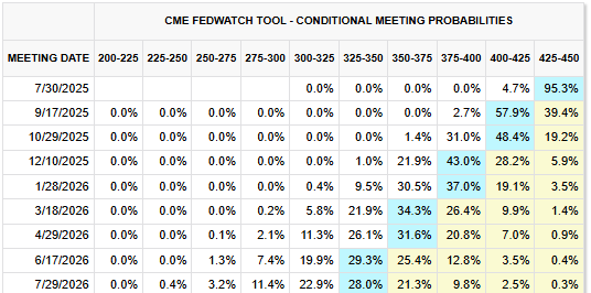 In mid-June, the Fed held the Federal Funds Rate at 425-450 but hinted at a July cut that got the market excited. That has largely been walked back with Jerome Powell saying last week he would prefer to keep rates steady. The market is still pricing in a 4.7% chance of him getting outvoted on July 30th, but the overwhelming likelihood is another hold from the Fed. The mid-September meeting is starting to gain traction as the meeting they will "finally" cut rates. See the below chart of the current market expectations of upcoming rate cuts. While a rate cut will not directly affect mortgage rates because the market is set using future rate expectations, it generally helps the housing market pick up due to the positive press of rates falling.